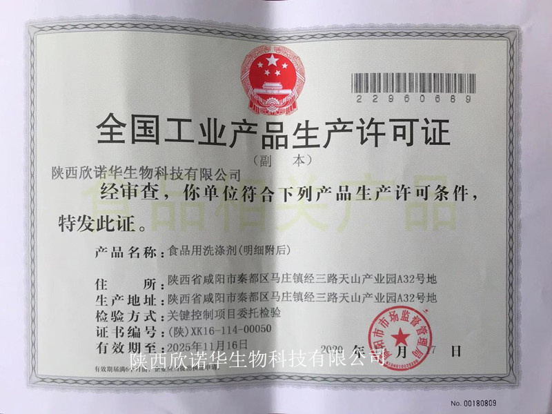 經(jīng)過公司上下齊心努力下,經(jīng)過半年的準(zhǔn)備,近日,順利通過陜西省市場監(jiān)督管理局的各項審核,成功取得了《全國工業(yè)產(chǎn)品生產(chǎn)許可證》,獲得食品用洗滌劑(手洗餐具洗滌劑,機(jī)洗餐具洗滌劑)生產(chǎn)資格,符合產(chǎn)品生產(chǎn)許可條件。陜西欣諾華生物科技有限公司成為同時具有機(jī)洗餐具洗滌劑B類,手洗餐具洗滌劑A類兩大類產(chǎn)品生產(chǎn)許可的企業(yè)。
